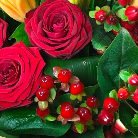 A vibrant selection in the Autumnal colours with Rich Red Roses, Orange liles and Green Shamrock blooms.