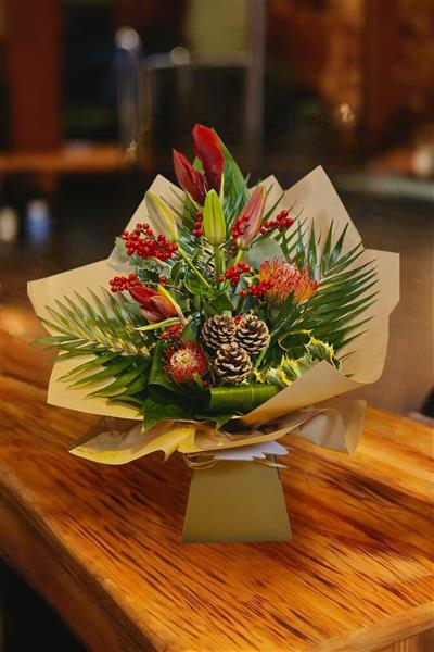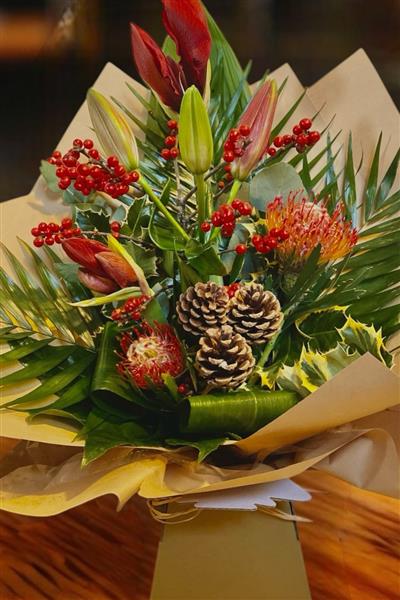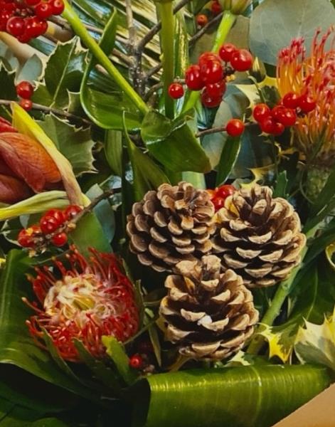 A stunning Christmas selection of Red Amaryllis, Red lilies, Protea Nutans and festive cones with Christmas foliage.