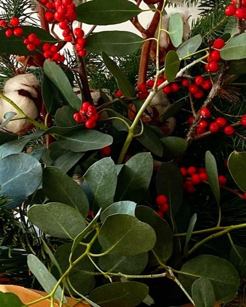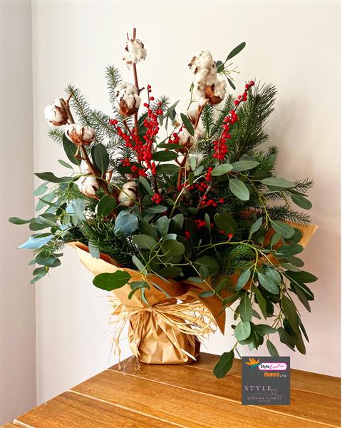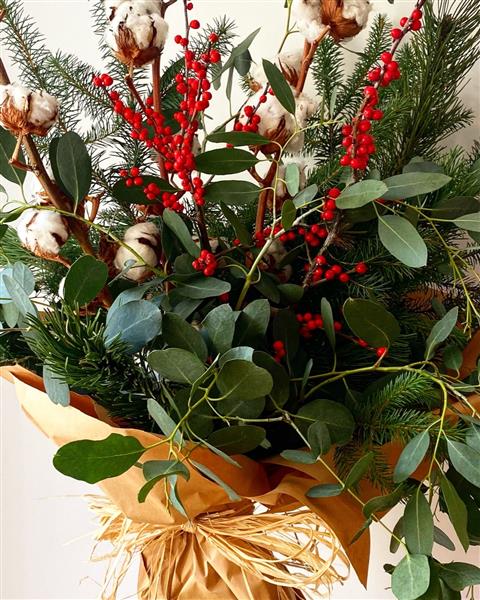 Our new Festive Cheer bouquet. Available now for all your Christmas orders! Long lasting with pine, Christmas ilex and cotton.