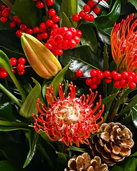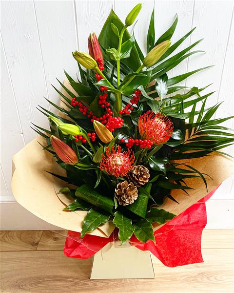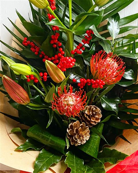 This is our gorgeous Red lily bouquet with tropical protea nutans and mixed foliage.