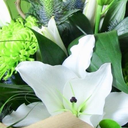 An elegant all round hand tie with White Oriental lilies, Scottish thistles with mixed foliage with twigs. This display makes an elegant gift for any occasion.