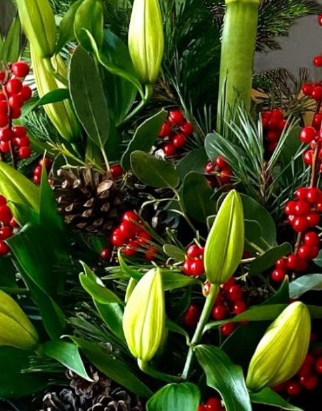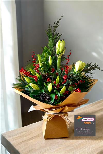 A stunning bouquet of White Amaryllis, White Oriental Lillie’s and ilex berries mixed with winter foliage.